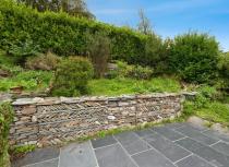 South-facing flower/shrub garden with a circa 19 square metre stone patio, newly built artisan dry stone wall, village and sea views.